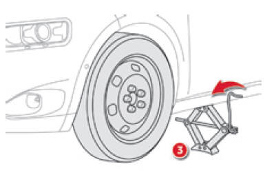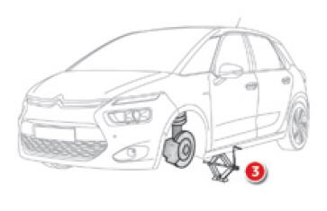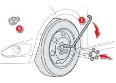 changement de roue Pour ranger correctement la roue crevée dans le coffre (pas dans le logement de la roue galette), retirez au préalable le cache central. En utilisant la roue de secours de type "galette", ne dépassez pas la vitesse de 80 km/h. Faites rapidement contrôler le serrage des vis et la pression de la roue de secours par le réseau CITROËN ou par un atelier qualifié. Faites réparer la roue crevée et replacez-la aussitôt sur le véhicule. |